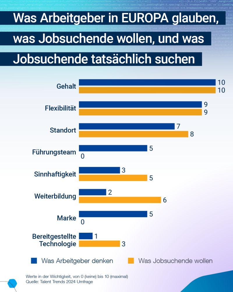 - Weiterbildung und Sinnhaftigkeit: Arbeitssuchende bewerten dies weitaus höher (6/10 und 5/10) als die Arbeitgeber es tun.